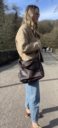 Can be worn on the shoulder or coss body. This tumbled grain dark brown leather bag has 2 exterior zip pockets and one large interior pocket.